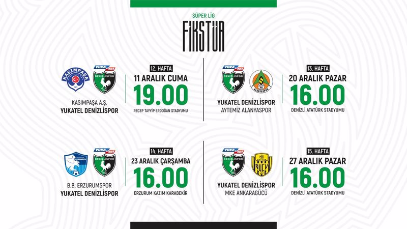 Türkiye Futbol Federasyonu tarafından açıklanan programa göre Yukatel Denizlispor’un maç fikstürü şu şekilde;